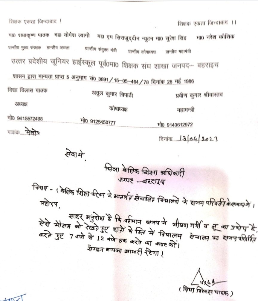 बहराइच: जनपद में लू के प्रकोप को देखते हुए शिक्षकों और बच्चो कोई समस्या न होने पाए इस संबंध में जनहित को ध्यान में रखते हुए उत्तर प्रदेशीय जूनियर हाईस्कूल शिक्षक संघ ने विद्यालयों के समय में परिवर्तन करने की मांग की है। जिला बेसिक शिक्षा अधिकारी अव्यक्त राम तिवारी को दिए गए मांग पत्र में जनपद में संचालित समस्त परिषदीय विद्यालयों का समय प्रातः 7:00 से दोपहर 12:00 बजे तक संचालित करवाए जाने की मांग की गई है