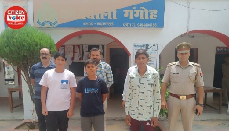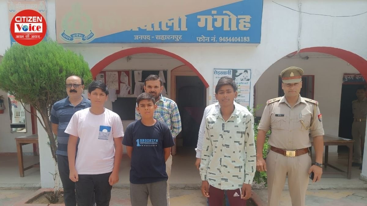 सहारनपुर : वरिष्ठ पुलिस अधीक्षक आकाश तोमर के मार्गदर्शन एवं पुलिस अधीक्षक ग्रामीण के निर्गत आदेशो निर्देशो के अनुपालन मे तथा क्षेत्राधिकारी गंगोह के निकट पर्यवेक्षण में आपरेशन मुस्कान के तहत चलाये जा रहे अभियान के अन्तर्गत कस्बा गंगोह से गुम हुये 03 बच्चे क्रमश शुभ पुत्र नवीन नि0 मौहल्ला टाकान कस्वा व थाना गंगोह जिला सहारनपुर, यश पुत्र मास्टर सुरेन्द्र नि0 मौ0 टांकान कस्वा व थाना गंगोह जिला सहारनपुर व लवीश पुत्र किरणपाल नि0 मौ0 टांकान कस्वा व थाना गंगोह जिला सहारनपुर को थाना गंगोह पुलिस द्वारा त्वरित कार्यवाही करते हुये मात्र 10 घण्टों के अन्दर दिल्ली रेलवे स्टेशन से सकुशल बरामद करने में महत्वपूर्ण सफलता प्राप्त की गई है। थाना गंगोह पुलिस द्वारा बरामद बच्चो को उनके परिजनो को सुपुर्द किया गय। परिजनों ने बच्चे पाकर सहारनपुर पुलिस का आभार प्रकट करते हुए भूरि भूरि प्रशंसा की है।