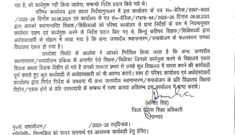 शासनादेश जारी होने के बाद भी संबंधित अधिकारी नहीं ले रहे रुचि हाल ही में हुई ट्रांसफर पोस्टिंग के कारण काफी स्कूल आए एकल शिक्षक श्रेणी में।नियम कायदा ताक पर रखकर अधिकारियों नें की ट्रांसफर पोस्टिंग।एकल शिक्षक के कारण प्रभावित हो रही शिक्षा की गुणवत्ता।एकल शिक्षक के कारण शिक्षण एवं अन्य प्रशासनिक काम पड़ते हैं संभालने। कोर्ट के आदेश के बावजूद अधिकारी शिक्षकों को वापस लाने का नहीं जारी कर रहे आदेश।हालात यह कि एक ही शिक्षक सभी कक्षाओं को एक साथ पढ़ानें को मजबूर।बीएसए के आदेश के बाद भी स्थानीय बीईओ नहीं जारी कर रहे शिक्षकों की वापसी की सूची।