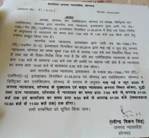 बता दें कि सोनभद्र जिला चार प्रांतों मध्यप्रदेश, छत्तीसगढ़, बिहार व झारखंड से सटा हुआ है। यहां की भौगोलिक स्थिति प्रदेश के अन्य जिलों से भिन्न है। जिसकी वजह से मई और जून माह में यहां पर भयंकर गर्मी पड़ती है। जिसके चलते इलाहाबाद हाईकोर्ट के 31 मई 2019 के दिशा निर्देश के अनुपालन में सोनभद्र बार एसोसिएशन सोनभद्र व डिस्ट्रिक्ट बार एसोसिएशन सोनभद्र के संयुक्त प्रस्ताव पर जनपद न्यायाधीश रविंद्र विक्रम सिंह ने 19 अप्रैल 2025 को दो माह (मई और जून) माह में मॉर्निंग कोर्ट संचालन का आदेश पारित किया है। यह आदेश जनपद न्यायालय सोनभद्र, वाह्य न्यायालय अनपरा स्थित ओबरा, दुद्धी व ग्राम न्यायालय घोरावल पर लागू होगा।