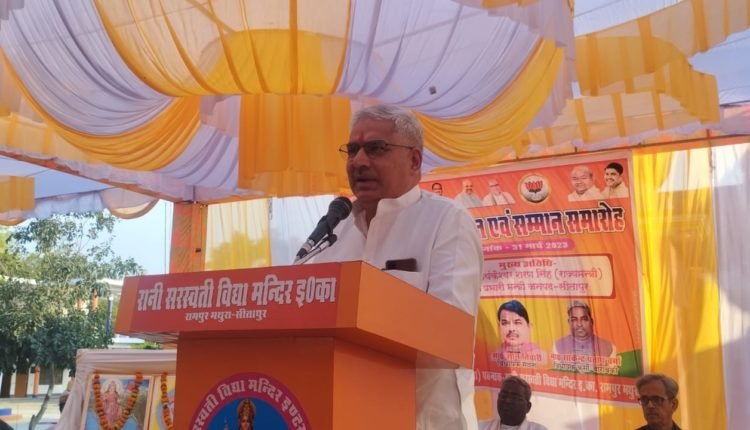 सीतापुर : The minister said in his address that I thank the manager of the school for the privilege of coming here.आज रामपुरमथुरा में आयोजित अभिनंदन एवं सम्मान समारोह सरस्वती शिशु विद्या मंदिर रामपुरमथुरा माननीय प्रभारी मंत्री, राज्यमंत्री संसदीय कार्य, चिकित्सा शिक्षा, चिकित्सा स्वास्थ्य, परिवार कल्याण तथा मातृ एवं शिशु कल्याण विभाग उत्तर प्रदेश मयंकेश्वर शरण सिंह जी, विशिष्ट अतिथि मा0 विधायक सेवता ज्ञान तिवारी एवं मा0 विधायक कुर्सी साकेत प्रताप वर्मा जी ने भारत माता एवं सरस्वती माता के चित्र पर माल्यार्पण व दीप प्रज्वलित कर कार्यक्रम का शुभारंभ किया। इस अवसर पर प्रधानों, पत्रकारों एवं विशिष्ट जनों को सम्मानित किया गया।
