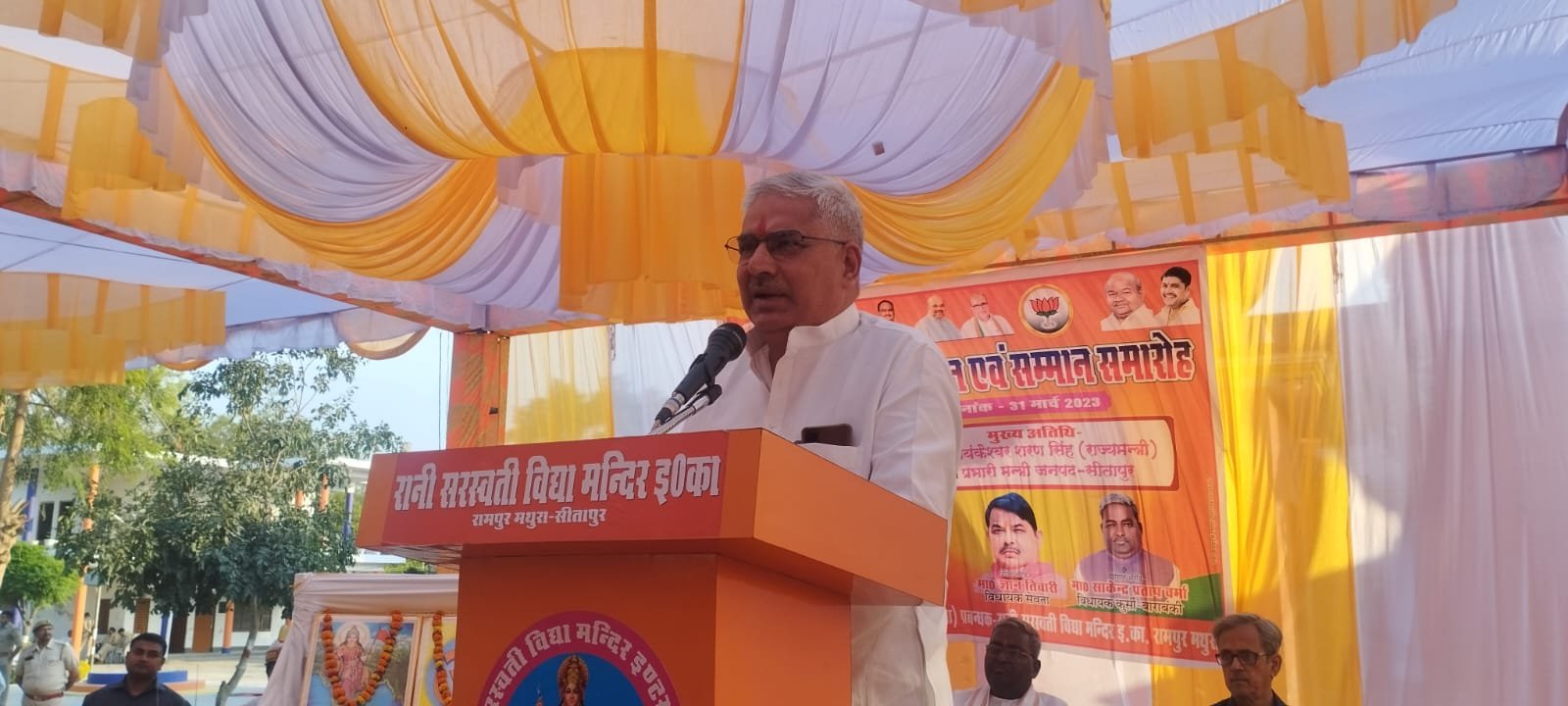 माननीय मंत्री जी ने अपने संबोधन में कहा कि विद्यालय के प्रबंधक को धन्यवाद देता हूं कि यहां आने का सौभाग्य प्राप्त हुआ, वैसे मेरा यहां बहुत बार आना जाना रहा है लेकिन अबकी बार आया हूं तो मुझे काफी कुछ विकास देखने को मिला है पहले जो सड़कें टूटी फूटी थी आज बहुत ही सही स्थिति में है जहां आने जाने का रास्ता नहीं था, वहां आज रास्ता बन गया है। पक्की सड़कें बन गई है यह डबल इंजन सरकार की ही देन है जो गांव-गांव तक सड़कों का निर्माण करा रही है उन्होंने कहा कि जब से भारत आजाद हुआ है तब से हमारी संस्कृति को हमारे बच्चों से दूर कर दिया गया है जिसको आज हमारी सरकार स्कूलों के माध्यम से भी बच्चों को सांस्कृति से जोड़ने का काम कर रही है। हमारी सरकार गांव प्रदेश व देश का विकास कर रही है। हमारी सरकार का लक्ष्य है कि अमृतकाल के 100 वर्ष पूर्ण होने पर हमारा देश विकासशील नहीं, बल्कि विकसित हो जैसा कि आप देख रहे हैं कि पहले की अपेक्षा रामपुर मथुरा में आज काफी विकास हुआ है हमारी सरकार गांव का कायाकल्प कर रही है, जिसके लिए वे सभी गांव को विकसित करने का काम कर रही है यही सरकार की मंशा है।
