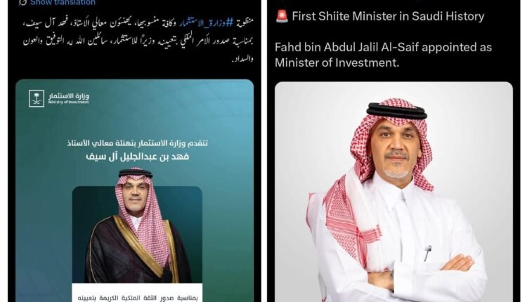 फहद बिन अब्दुल जलील अल-सैफ को सऊदी अरब का निवेश मंत्री नियुक्त किया गया है, जो सऊदी में पहले शिया मंत्री बने हैं!