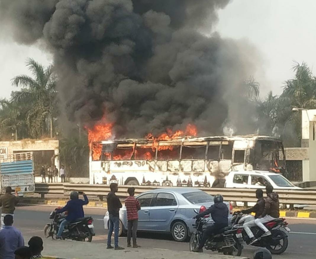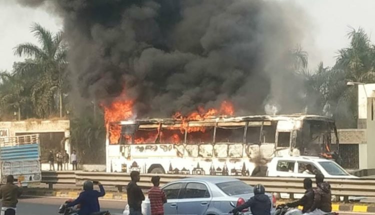लखनऊ: सफेदाबाद में लखनऊ अयोध्या नेशनल हाईवे पर लखनऊ और बाराबंकी जिलों की सीमा के पास एक रोडवेज बस में अचानक आग लग गई चालक ने सूझबूझ का परिचय देते हुए सभी यात्रियों को सुरक्षित बाहर निकाल लिया। इसके बाद पूरी बस जल गई सोमवार दोपहर अवध डिपो की बस लखनऊ की ओर जा रही थी और इस दौरान अचानक बस के अगले हिस्से में आग जलने लगी यह देखकर चालक ने बस रोक दी और आनन-फानन में परिचालक की सहायता से बस के अंदर बैठी 40 से अधिक सवारियों को बाहर निकाला सूचना पाने के बाद लखनऊ और बाराबंकी से फायर बिग्रेड की गाड़ियां मौके पर पहुंची। अफरातफरी के बीच जब तक फायर बिग्रेड की गाड़ियां बस की आग बुझाती तब तक बस जल चुकी थी। केवल उसका ढांचा खड़ा था बस में आग लगने के कारण करीब एक घंटे तक हाइवे पर एक तरफ का यातायात प्रभावित रहा। इस दौरान हाइवे पर दोनों और लंबा जाम लग गया और लोग दहशत में दिखे। अग्निशमन विभाग के अनुसार शार्ट सर्किट के कारण बस में आग लगी थी।