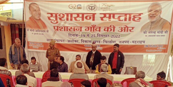 बहराइच। शासन के निर्देश पर जिलाधिकारी डॉ दिनेश चन्द्र के कुशल मार्गदर्शन में 19 से 25 दिसम्बर 2022 तक तहसील व ब्लाक मुख्यालय तथा ग्राम पंचायत स्तर पर आयोजित हो रहे ‘‘सुशासन सप्ताह-प्रशासन गांव की ओर’’ कार्यक्रम के अन्तर्गत विकास खण्ड चित्तौरा के ग्राम अशोका के पंचायत भवन में आयोजित विशेष शिविर के दौरान जिला विकास अधिकारी महेन्द्र कुमार पाण्डेय द्वारा ग्रामीणों को सरकार द्वारा चलाई जा रही विभिन्न योजनाओं के बारे में विस्तार से जानकारी प्रदान की गयी। साथ ही जन समस्याओं का निराकरण भी किया गया। उल्लेखनीय है कि तहसील व ब्लाक मुख्यालय तथा ग्राम पंचायत स्तर पर विशेष शिविर का आयोजन कर कृषक दुघर्टना सहायता योजना, मा. मुख्यमंत्री खेत-खलिहान अग्निकाण्ड दुघर्टना सहायता योजना, लोक सम्बोधन प्रणाली के लिए अनुज्ञा, निवास, जाति, आय, जन्म, मृत्यु प्रमाण पत्र, खतौनी की नकल, रोजगार पंजीकरण व नवीनीकरण, कुटुम्ब रजिस्टर की नकल, वृद्धा पेंशन, असहाय व्यक्तियों के इलाज तथा उनकी पुत्री की शादी के लिए वित्तीय सहायता, राष्ट्रीय पारिवारिक लाभ योजना, सामान्य पिछड़ा वर्ग, अनुसूचित जाति, जनजाति, छात्रवृत्ति, विधवा पेंशन, दम्पत्ति पुरस्कार योजना, दहेज प्रथा से पीड़ित महिलाओं को आर्थिक सहायता, विधवा महिला की पुत्री की शादी हेतु अनुदान, विकलांग पेंशन, विकलांग व्यक्तियों को बनावटी अंग लगवाने हेतु, विकलांग व्यक्तियों के पुर्नवास हेतु ऋण अनुदान की सुविधा, विकलांग व्यक्तियों के विवाह करने पर अनुदान, विकलांग प्रमाण पत्र इत्यादि सेवाएं प्रदान की जा रही है।इस अवसर पर खंड विकास अधिकारी संदीप कुमार त्रिपाठी ज्वाइंट बीडीओ सूर्य प्रकाश मिश्रा एडीओ पंचायत विधानचंद्र एपीओ संदीप त्रिपाठी सहित ब्लाक स्तरीय अधिकारी और कर्मचारी मौजूद रहे।