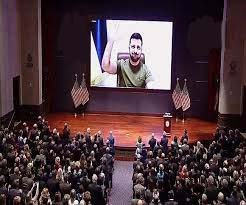 वर्चुअल संबोधन में जेलेंस्की ने रूस के साथ युद्ध में अमेरिका के समर्थन के लिए आभार व्यक्त किया संबोधन के दौरान अमेरिकी कांग्रेस के सदस्यों ने जेलेंस्की को सम्मान देते हुए उन्हें स्टैंडिंग ओवेशन भी दिया