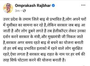 लखनऊ : उत्तर प्रदेश सुभासपा अध्यक्ष ओम प्रकाश राजभर का ट्वीट बाढ़ प्रभावित इलाकों में योगी के दौरे पर निशाना बाढ़ में डूब रहे लोगों का दर्शन करने जाते हैं सीएम OP राजभर योगी सरकार बाढ़ राहत के नाम पर घोटाला कर रही है OP राजभर