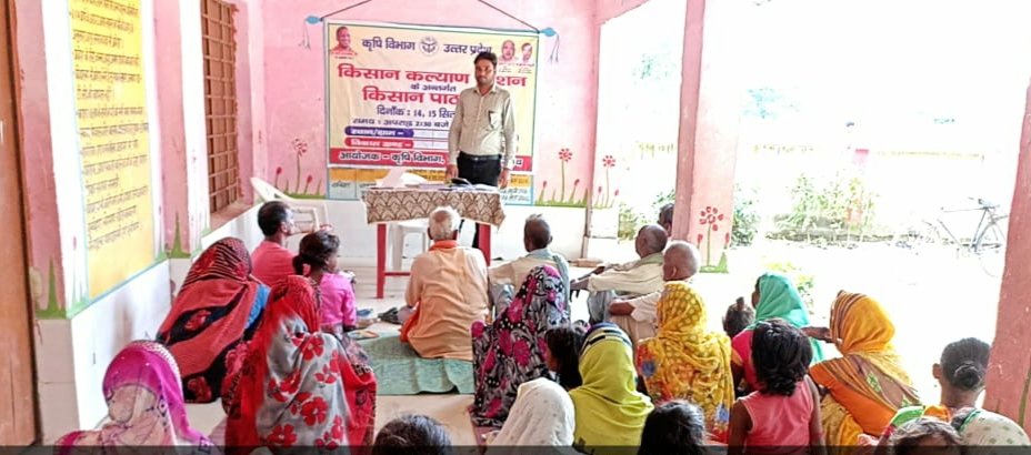 बहराइच : कृषि विभाग द्वारा खरीफ अभियान में दो दिवसीय किसान कल्याण योजना के अंतर्गत विकास खंड चित्तौरा के न्याय पंचायत कटरा बहादुर गंज स्थित पूर्व माध्यमिक विद्यालय में बुधवार को किसान पाठशाला का आयोजन किया गया। इसमें कृषि विविधिकरण, जैविक खेती, मूल्य संव‌र्द्धन व पराली प्रबंधन विषयों पर प्रशिक्षण किसानों को दिया गया। ग्राम प्रधान प्रतिनिधि की अध्यक्षता में आयोजित किसान पाठशाला में उपस्थित किसानों को प्रशिक्षण दिया गया। तकनीकी सहायक विकास अधिकारी अनिल कुमार यादव ने आयोजित किसान पाठशाला में उन्हें फसल बीमा व जैविक खेती, किसान सम्मान निधि योजना, बीज ग्राम योजना, राष्ट्रीय खाद्य सुरक्षा मिशन योजना, प्रधानमंत्री फसल बीमा योजना के संबंध में जानकारी दी।