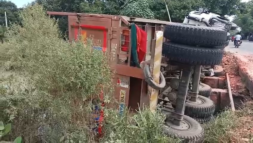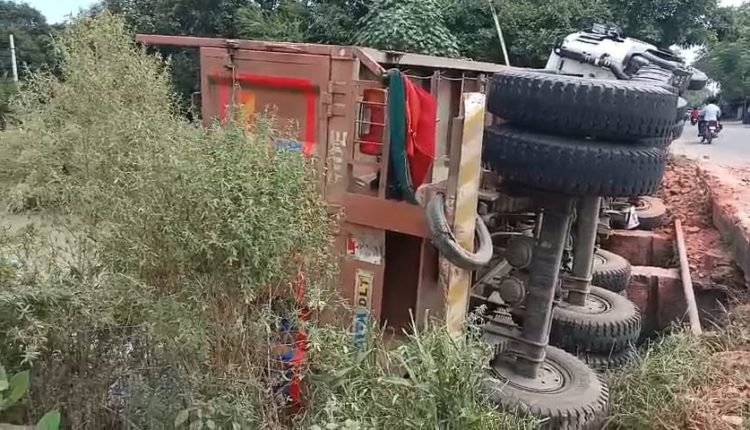 रेलिंग विहीन नहर पुलिया के पास पलटा अनियंत्रित डंपर, चालक गंभीर रूप से घायल