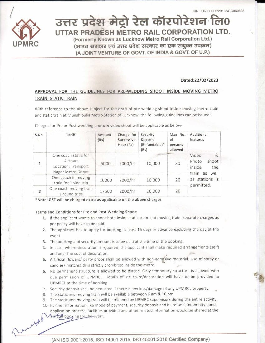 आधुनिक, शहरी माहौल में अपने प्री-वेडिंग क्षणों को कैद करने के इच्छुक जोड़ों के लिए यूपी मेट्रो ने पेशेवर फोटोशूट के लिए मेट्रो स्टेशन और ट्रेनें भी खोल दी हैं। मेट्रो के आकर्षक इंटीरियर और सुंदर शहर के दृश्य यादगार तस्वीरों के लिए एक बेहतरीन पृष्ठभूमि मुहैया कराते हैं। उत्तर प्रदेश मेट्रो रेल कॉरपोरेशन के प्रबंध निदेशक श्री सुशील कुमार ने कहा ने कहा, “हमारा लक्ष्य मेट्रो को महज एक परिवहन के जरिए से ज्यादा बनाना है। अपनी ट्रेनों और स्टेशनों के अंदर समारोह और रचनात्मक कार्यक्रमों की अनुमति देकर हम यात्रियों को मेट्रो का लुत्फ लेने का एक अनूठा तरीका मुहैया करा रहे हैं।”