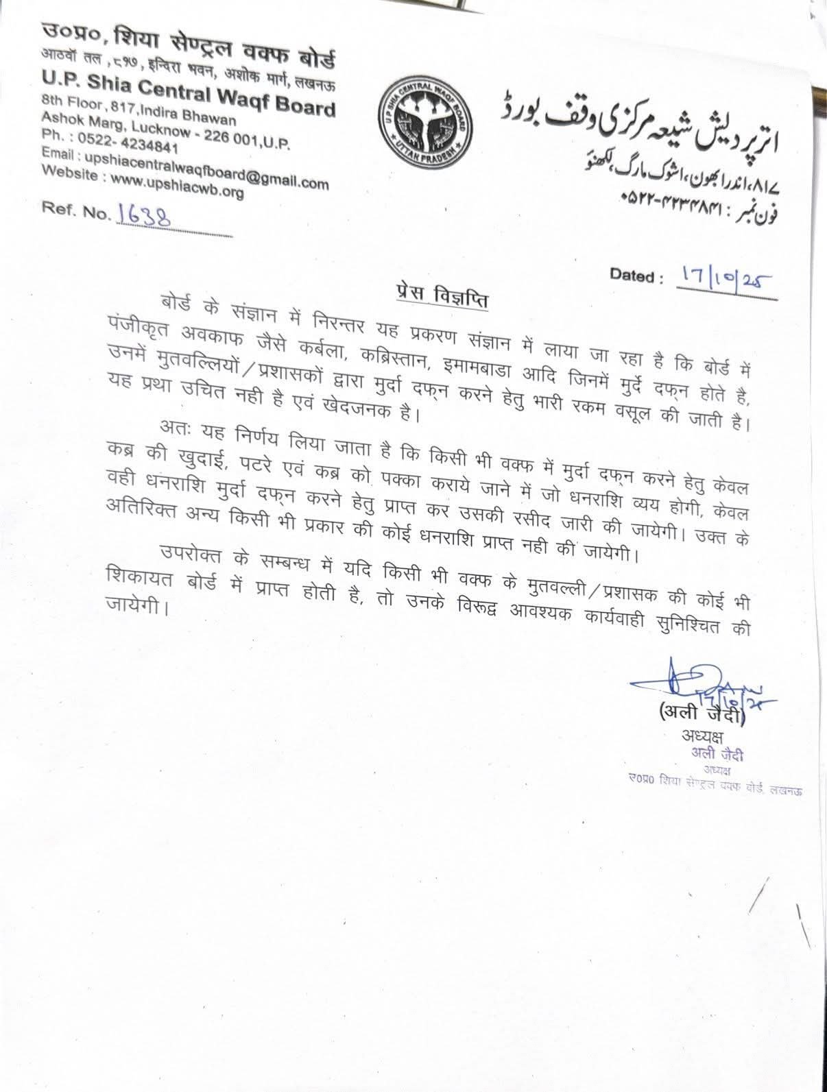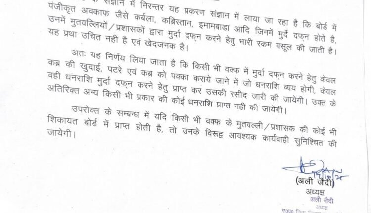 Shia Waqt Board News:UP शिया सेंट्रल वक्फ बोर्ड की बड़ी कार्रवाई कब्रिस्तान इमामबाड़ा में मुरदा दफनाने के नाम पर वसूली पर रोक वक्फ संपत्ति में कब्र या दफन के लिए कोई शुल्क नहीं लिया जाएगा-बोर्ड शिकायत मिलने पर मुतवल्ली प्रशासकों पर होगी सख्त कार्रवाई-बोर्डबोर्ड अध्यक्ष अली जैदी ने जारी किया सख्त निर्देश