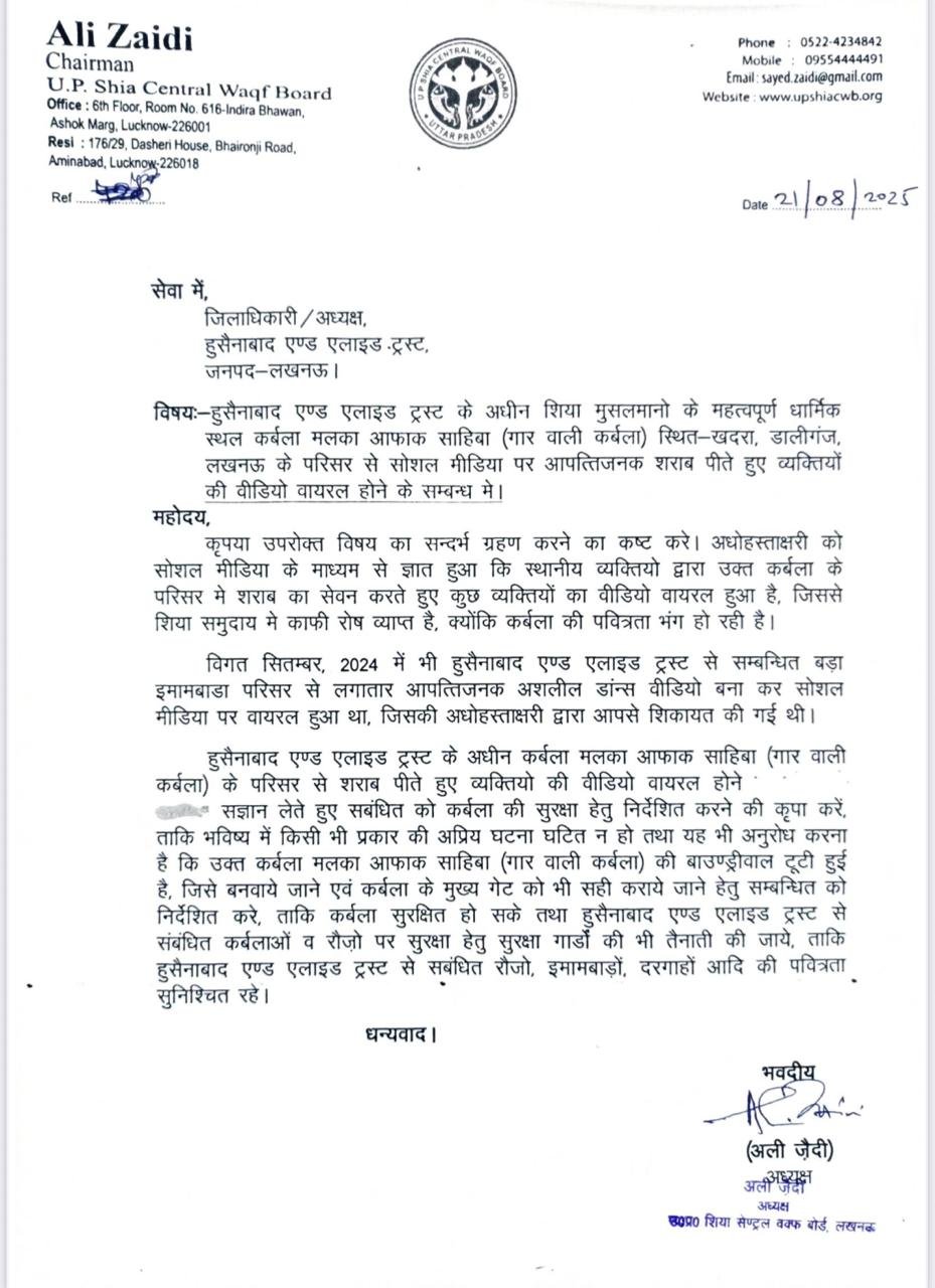 DM व हुसैनाबाद ट्रस्ट चेयरमैन को भेजा पत्र, धार्मिक स्थलों की सुरक्षा बढ़ाने की करी मांग, इमामबाड़ा और दरगाहों की पवित्रता बनाए रखने का निवेदन।