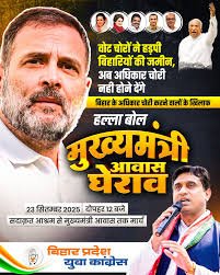 Bihar News::बिहार की सियासत में विपक्ष ने सरकार को घेरना शुरू कर दिया है। आज Youth Congress के कार्यकर्ताओं ने मुख्यमंत्री के आवास का घेराव किया। उनके नारे थे — “वोट चोर, नौकरी चोर, भूमि चोर”।