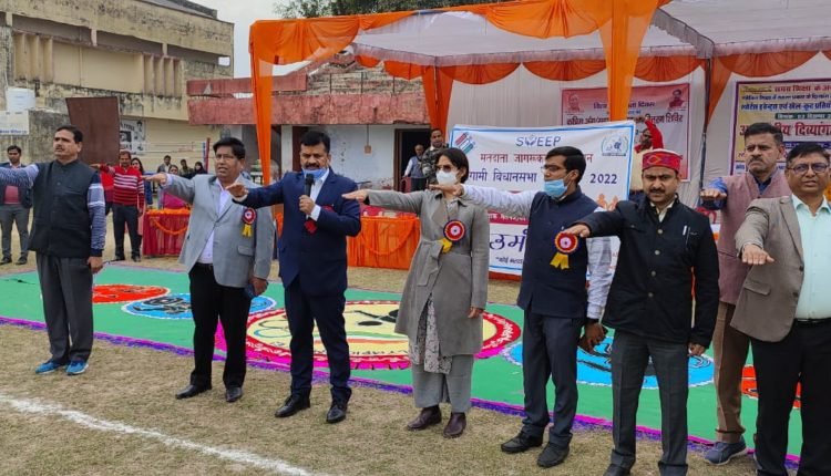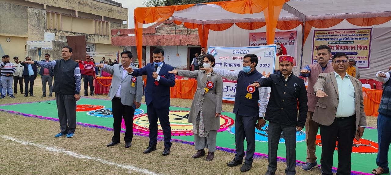 बहराइच : विश्व दिव्यांगता दिवस के अवसर पर इन्दिरा स्टेडियम बहराइच में आयोजित कृत्रिम अंग सहायक उपकरण वितरण शिविर के अवसर पर भारत निर्वाचन आयोग के निर्देशानुसार निर्वाचक नामावलियों के विशेष संक्षिप्त पुनरीक्षण कार्यक्रम में सभी अर्ह दिव्यांग नागरिकों का नाम मतदाता सूची में सम्मिलित कराये जाने तथा आसन्न विधानसभा सामान्य निर्वाचन-2022 के मतदान में जनपद के शत-प्रतिशत दिव्यांग मतदाताओं की सहभागिता सुनिश्चित किये जाने के उद्देश्य से मतदाता शिक्षा एवं निर्वाचक सहभागिता (स्वीप) कार्यक्रम अन्तर्गत जिलाधिकारी डॉ. दिनेश चन्द्र ने शिविर में मौजूद दिव्यांगजनों व अन्य नागरिकों को मतदाता जागरूकता की शपथ दिलायी।