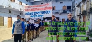 बहराइच : जागो रे जागो मतदाता भारत निर्वाचन आयोग के निर्देशानुसार निर्वाचक नामावलियों के विशेष संक्षिप्त पुनरीक्षण कार्यक्रम में सभी अर्ह नागरिकों को नाम सम्मिलित कराये जाने तथा आसन्न विधानसभा सामान्य निर्वाचन-2022 के मतदान में जनपद के शत-प्रतिशत मतदाताओं की सहभागिता सुनिश्चित किये जाने के उद्देश्य से मतदाता शिक्षा एवं निर्वाचक सहभागिता (स्वीप) अन्तर्गत सर्वोदय इण्टर कालेज मिहींपुरवा में मतदाता जागरूकता रैली का आयोजन किया गया।