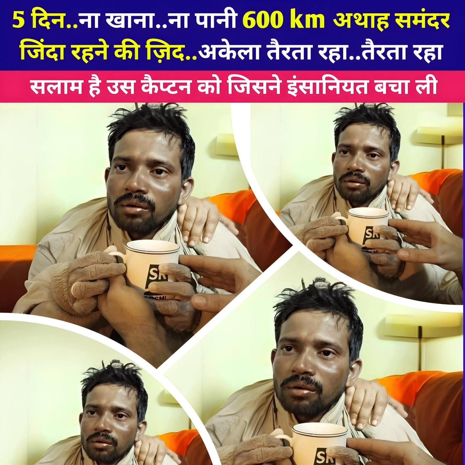 पांच दिन ना खाना, ना पानी 600 किलोमीटर अथाह समुंदर केवल जिंदा रहने का जुनून,,, अकेला तैरता , तैरता रहा! दक्षिण 24 परगना पश्चिम बंगाल का रहने वाला ये शख्स  6 साल पहले 15 साथियों के साथ समुंदर में मछ्ली पकड़ने गया था।