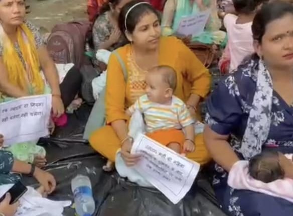 एससीईआरटी कार्यालय पर अपने छोटे-छोटे बच्चों के साथ दे रही धरना